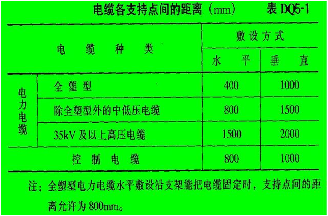 4. The distance between the supporting points of the cable should meet the design regulations. When the design is not specified, the length shall not be greater than the value listed in Table DQ5-1.